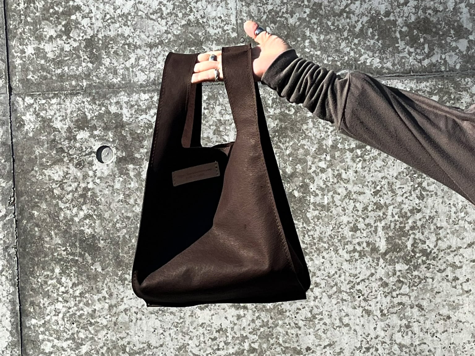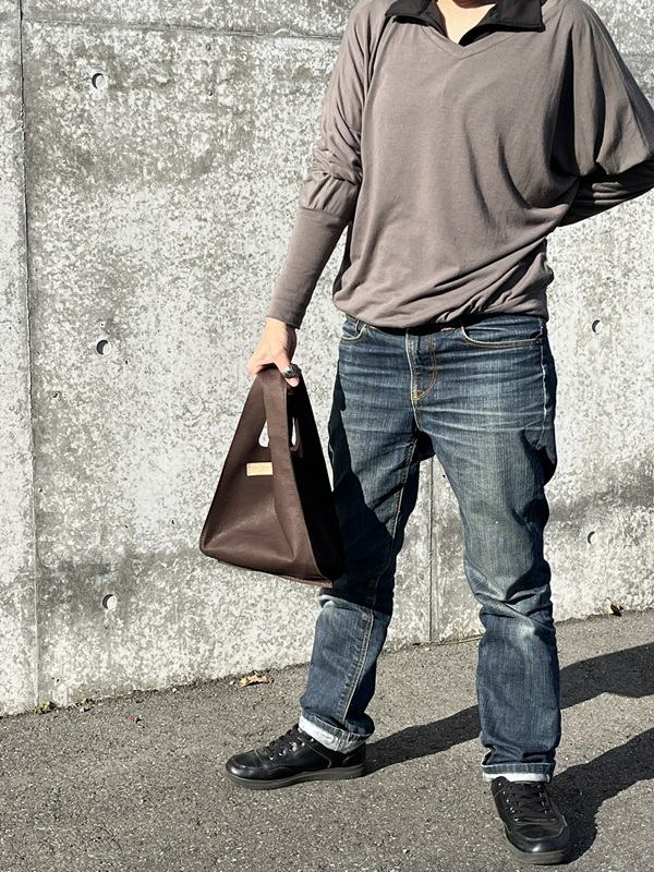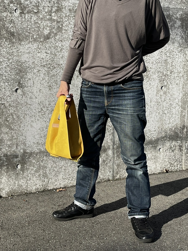 持つ人のさりげない脇役として年中、持ち歩いても飽きない、男女問わず、ギフトに自分用に選んでいただきたい1台なのです。私たちの目指しているのは素材の良さをシンプルに表現する事。だから裏地もポケットも金具もありません。とことんレジ袋風のデザインに近づけました。外縫いすることにより荷物を入れてない時はペタンコになり三つ折りに畳んでメインバッグにも収納できます。